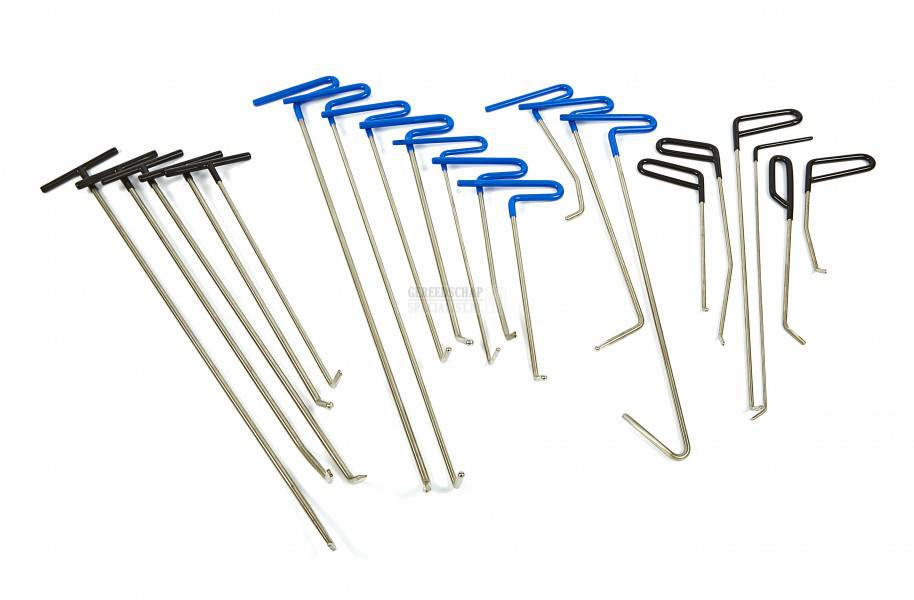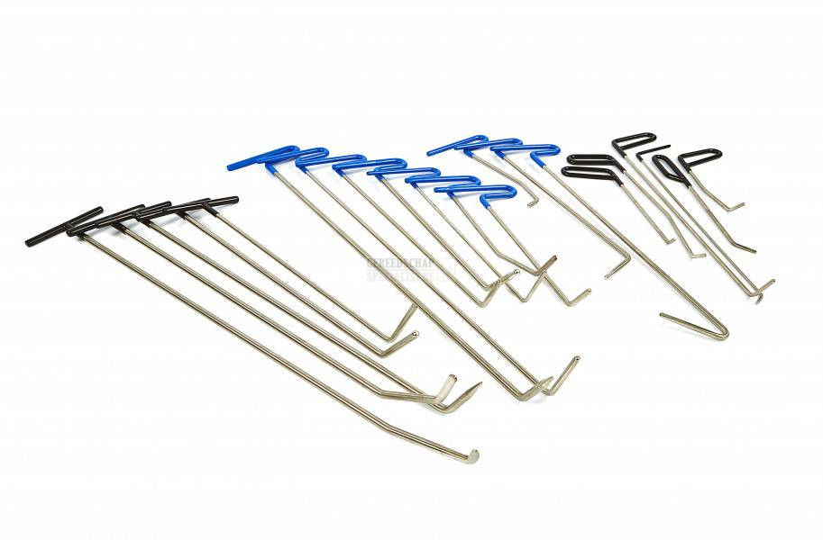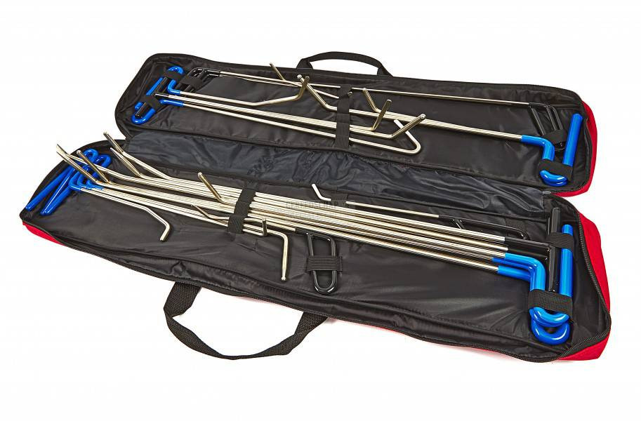 Voor het repareren van deuken op moeilijk bereikbare plaatsen gebruik je deze 21-delige set uitdeukstaven. De set is van zeer professionele kwaliteit en bevat staven in verschillende vormen en maten. Ze zijn vooral geschikt om kleinere deuken op lastige plekken te repareren zonder dat de lak wordt beschadigd. De set wordt geleverd in een handige kunststof draagtas.