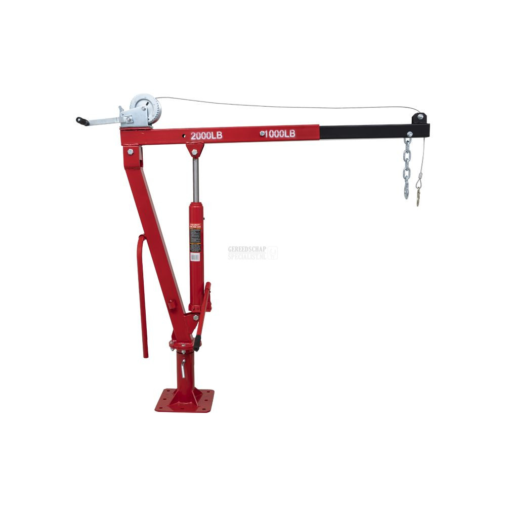Deze aanhangwagenkraan met een capaciteit van 900 Kg wordt geleverd met 2 jaar garantie.