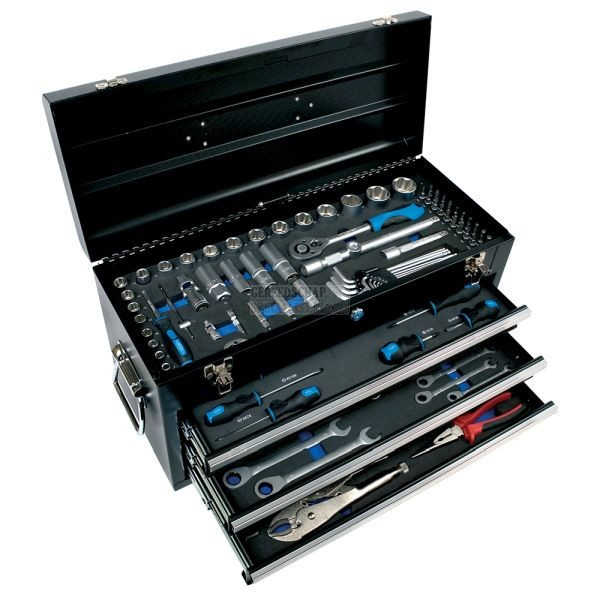 AIRPRESS gereedschapskoffer 97-dlg. Afsluitbare stalen gereedschapskist voorzien van 3 laden en een bovenbak. Inhoud 97 stuks chroom vanaduim gereedschap.