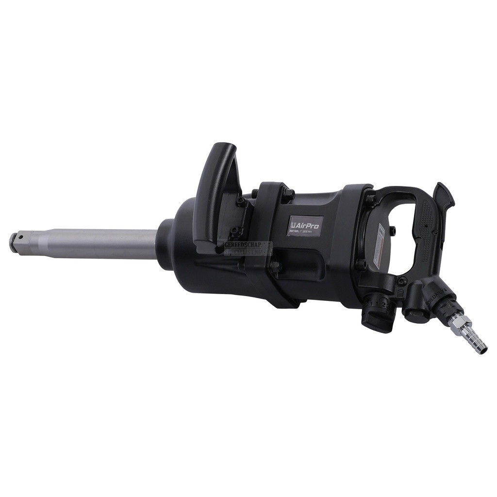 Slagmoersleutel 1'' Ideaal voor reparatiewerkzaamheden aan trucks, banden en zware apparatuur. De verwijderbare zij hendel zorgt voor de perfecte controle. - aansluiting = 1" - capaciteit = 45mm - max. toerental = 3,200rpm - kracht = 3500Nm - luchtaansluiting = 1/2" - slangaansluiting = 1/2" - gemiddeld luchtverbruik = 650 L/min - werkdruk = 6,3 bar - pinless