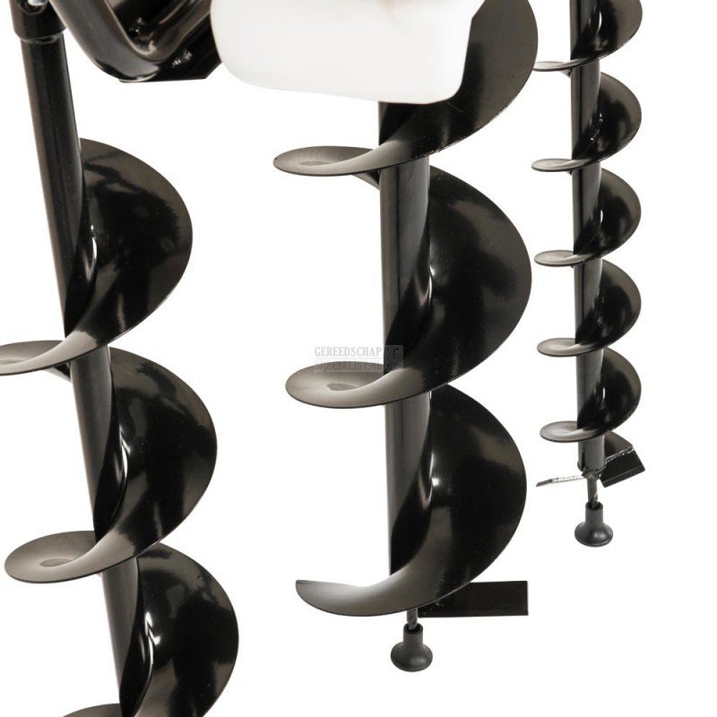 Stopknop en gashandel zijn gemonteerd aan de rechter handgreep. Er zijn boren leverbaar van 60mm tot 300mm. Standaard boorlengte 80cm. Wij adviseren voor deze machine een maximale diameter van 200mm en in zanderige gronden 250mm. Mochten de boren qua lengte niet voldoende zijn dan hebben wij eventueel 2 verlengstukken leverbaar. Eén verlengstuk van 400mm (deze is volledig massief) en één van 600mm.